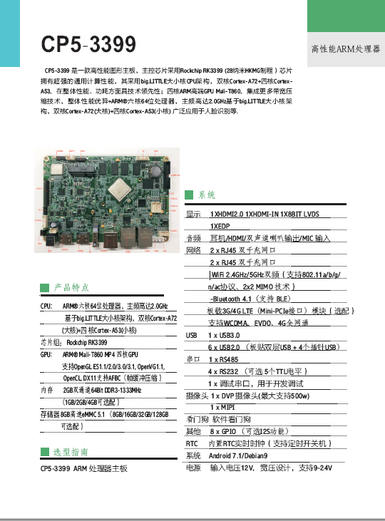 CP5-3399 是一款高性能圖形主板,主控芯片采用Rockchip RK3399 (28納米HKMG制程)芯片
