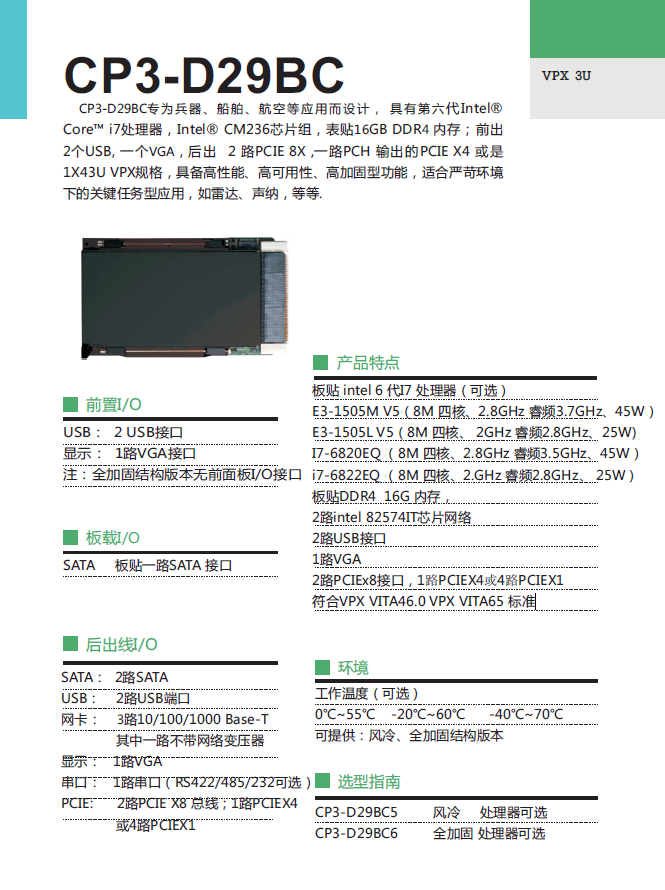 CP3-D29BC專為兵器、船舶、航空等應用而設計, 具有第六代Intel? Core? i7處理器,Intel? CM236芯片組,表貼16GB DDR4 內存;前出 2個USB, 一個VGA , 后出 2 路PCIE 8X ,一路PCH 輸出的PCIE X4 或是 1X43U VPX規...