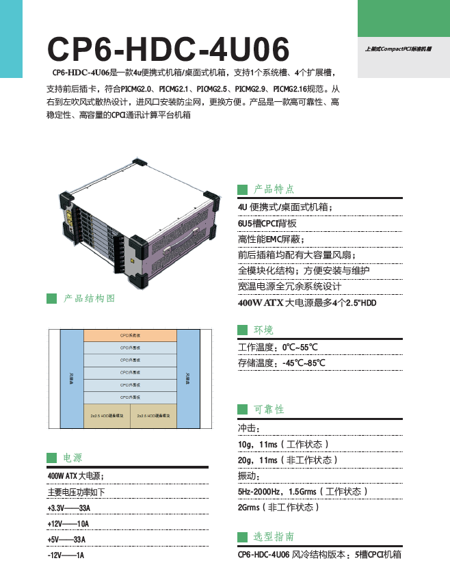 CP6-HDC-4U06是一款4u便攜式機(jī)箱/桌面式機(jī)箱,支持1個(gè)系統(tǒng)槽、4個(gè)擴(kuò)展槽,支持前后插卡,符合PICMG2.0、PICMG2.1、PICMG2.5、PICMG2.9、PICMG2.16規(guī)范。從右到左吹風(fēng)式散熱設(shè)計(jì),進(jìn)風(fēng)口安裝防塵網(wǎng),更換方便。產(chǎn)...