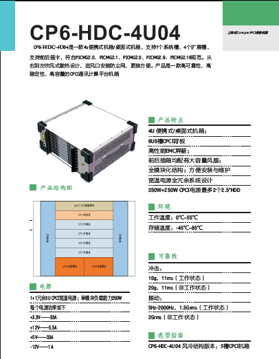 CP6-HDC-4U04是一款4u便攜式機箱/桌面式機箱,支持1個系統槽、4個擴展槽,支持前后插卡,符合PICMG2.0、PICMG2.1、PICMG2.5、PICMG2.9、PICMG2.16規范。從右到左吹風式散熱設計,進風口安裝防塵網,更換方便。產品...