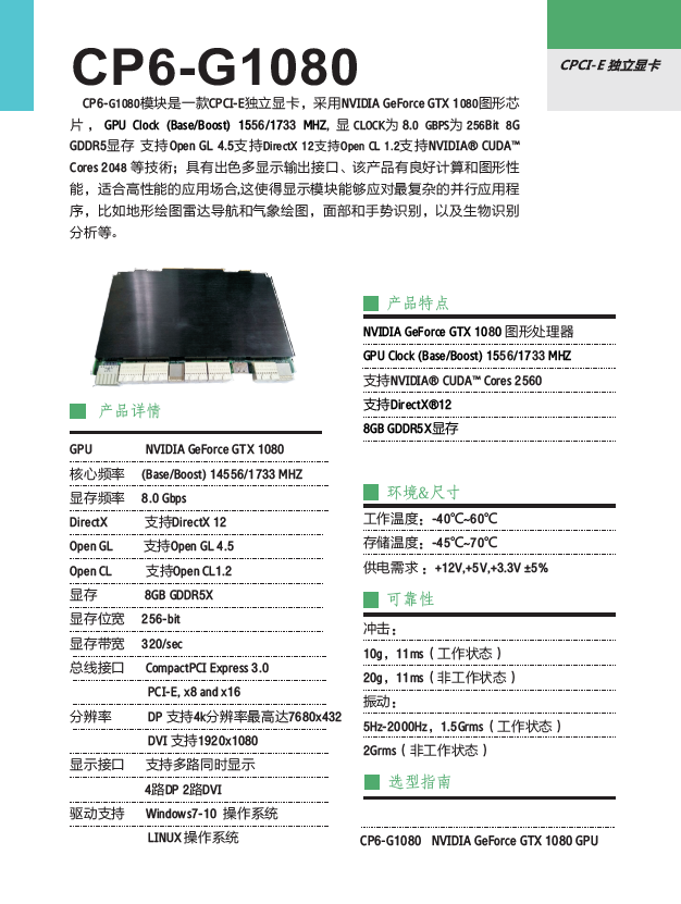 CP6-G1080模塊是一款CPCI-E獨立顯卡,采用NVIDIA GeForce GTX 1080圖形芯片,GPU Clock (Base/Boost)