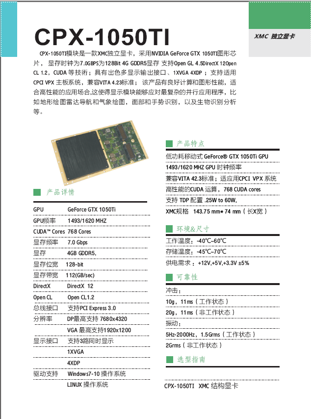 CPX-1050TI模塊是一款XMC獨立顯卡,采用NVIDIA GeForce GTX 1050TI圖形芯片, 顯存時鐘為7.0GBPS為128Bit