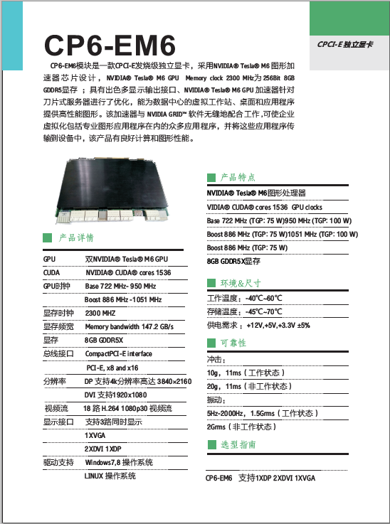 CP6-EM6模塊是一款CPCI-E發燒級獨立顯卡,采用NVIDIA? Tesla? M6 圖形加