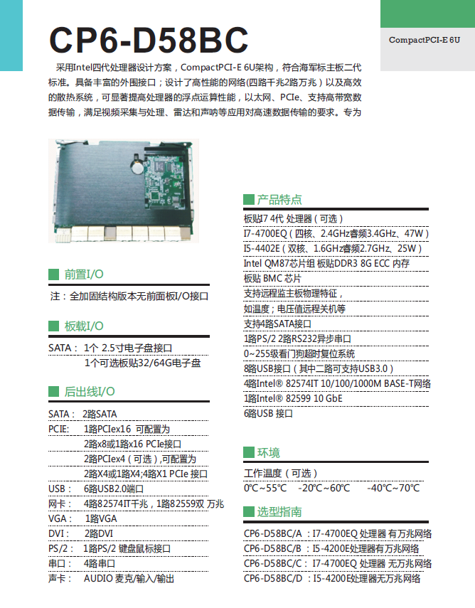 采用Intel四代處理器設(shè)計方案,CompactPCI-E 6U架構(gòu)符合海軍標(biāo)主板二代