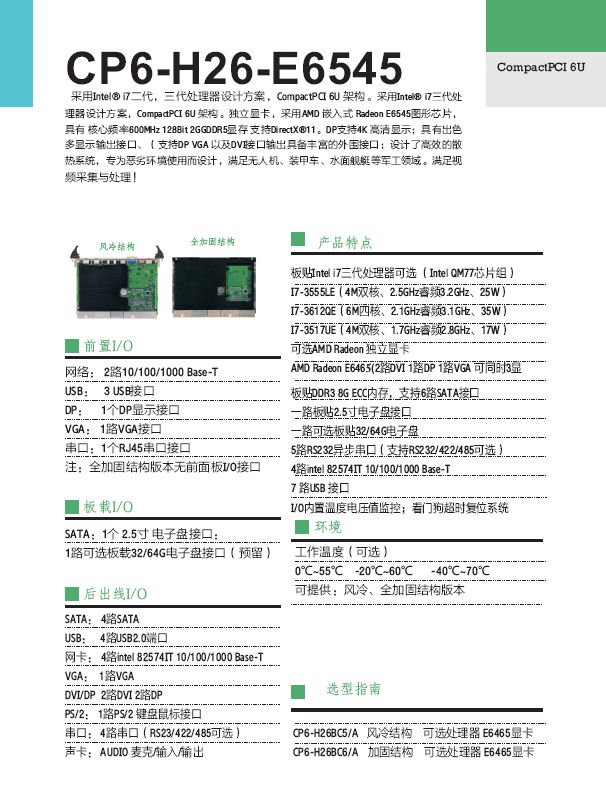 理器設計方案,CompactPCI 6U 架構。獨立顯卡,采用AMD 嵌入式 Radeon E6545圖形芯片,