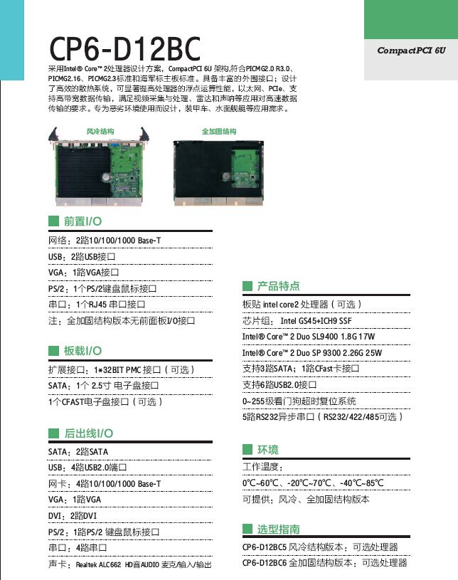 CP6-D12BC 采用Intel? Core? 2處理器設計方案,CompactPCI 6U 架構,符合PICMG2.0 R3.0、 PICMG2.16、PICMG2.3標準和海軍標主板標準。具備豐富的外圍接口;設計 了高效的散熱系統,可顯著提高處理器的浮點運算性能...