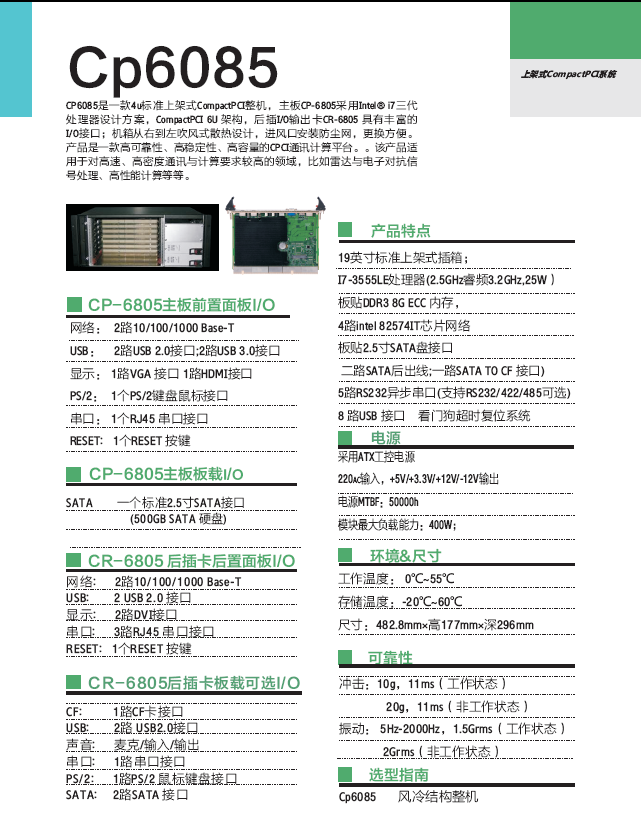 CP6085是一款4u標準上架式CompactPCI整機,主板CP-6805采用Intel? i7三代 處理器設計方案,CompactPCI 6U 架構,后插I/O輸出卡CR-6805 具有豐富的 I/O接口;機箱從右到左吹風式散熱設計,進風口安裝防塵網,更換方...