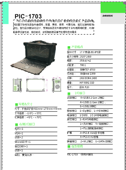 PIC-1703是針對(duì)車載和野外工作環(huán)境開發(fā)的一款便攜式計(jì)算機(jī),產(chǎn)品采用專用加固主板和優(yōu)質(zhì)鋁合金結(jié)構(gòu),堅(jiān)固、