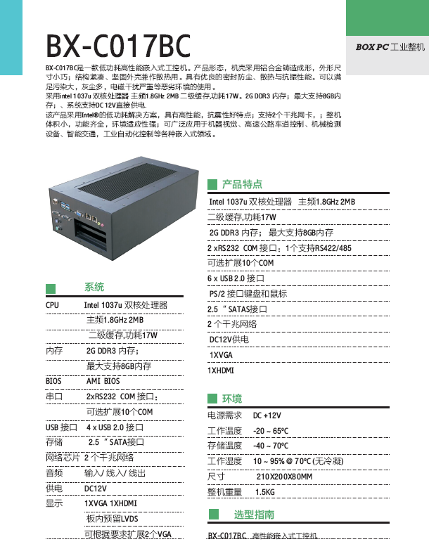 BX-C017BC是一款低功耗高性能嵌入式BOX PC工控機。產(chǎn)品形態(tài),機殼采用鋁合金鑄造成形,外形尺 寸小巧;結構緊湊、堅固外殼兼作散熱用。具有優(yōu)良的密封防塵、散熱與抗振性能。可以滿 足污染大,灰塵多,電磁干擾嚴重...