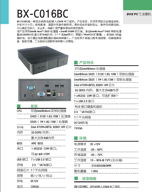BX-C016BC是一款低功耗高性能嵌入式工控機。產品形態,機殼采用鋁合金鑄造成形,外形尺 寸小巧;結構緊湊、堅固外殼兼作散熱用。具有優良的密封防塵、散熱與抗振性能。可以滿 足污染大,灰塵多,電磁干擾嚴重等惡劣...