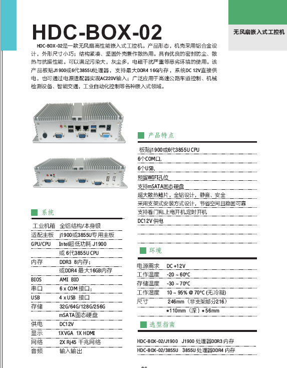 HDC-BOX-02是一款無風(fēng)扇高性能嵌入式工控機(jī)。產(chǎn)品形態(tài),機(jī)殼采用鋁合金設(shè)計,外形尺寸小巧;結(jié)構(gòu)緊湊、堅固外殼兼作散熱用。具有優(yōu)良的密封防塵、散熱與抗振性能。可以滿足污染大,灰塵多,電磁干擾嚴(yán)重等惡劣環(huán)境...