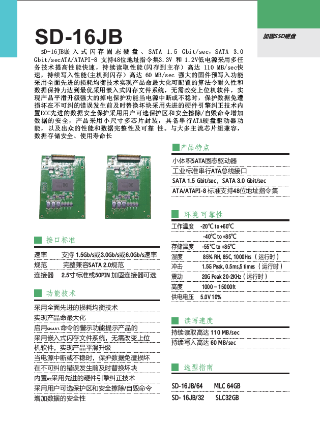 SD-16JB嵌入式閃存固態(tài)硬盤、SATA 1.5 Gbit/sec,SATA 3.0 Gbit/secATA/ATAPI-8 支持48位地址指令集采用多任務(wù)技術(shù)