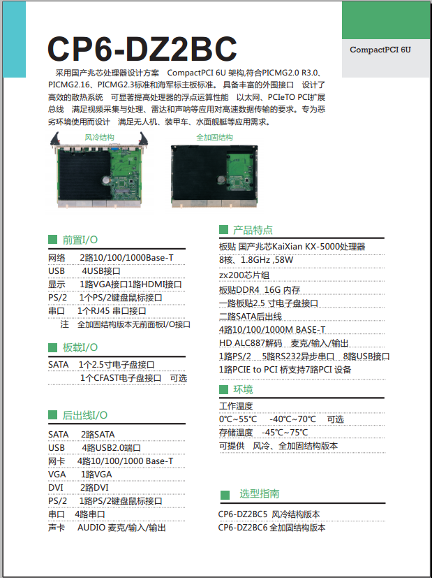 采用國產(chǎn)兆芯處理器設計方案,CompactPCI 6U 架構 符合PICMG2.0 R3.0、PICMG2.16、PICMG2.3標準和海軍標主板標準。具備豐富的外圍接口;設計了高效的散熱系統(tǒng),可顯著提高處理器的浮點運算性能,以太網(wǎng)、PCIeTO P...
