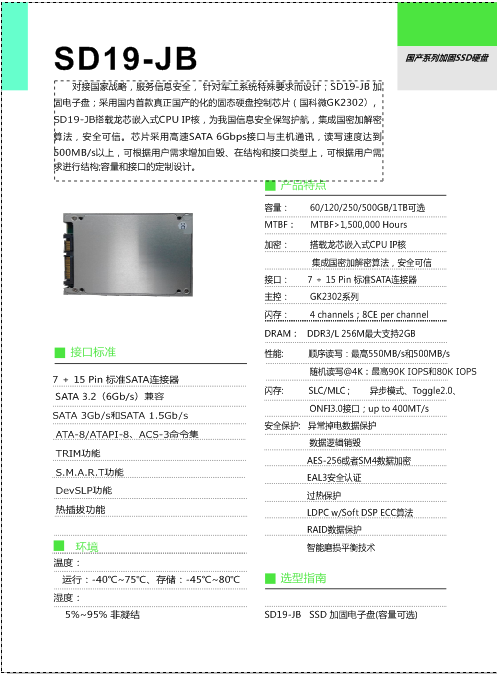對接國家戰略,服務信息安全, 針對系統特殊要求而設計;SD19-JB 加固電子盤;采用國內首款真正國產的化的固態硬盤控制芯片(國科微GK2302),SD19-JB搭載龍芯嵌入式CPU IP核,為我國信息安全保駕護航,集成國密加解...
