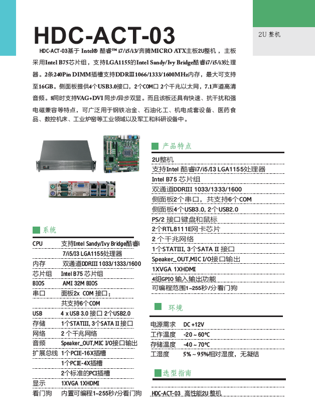 HDC-ACT-03基于 Intel? 酷睿? i7/i5/i3/奔騰MICRO ATX主板2U整機 ,主板采用Intel B75芯片組,支持LGA1155的
